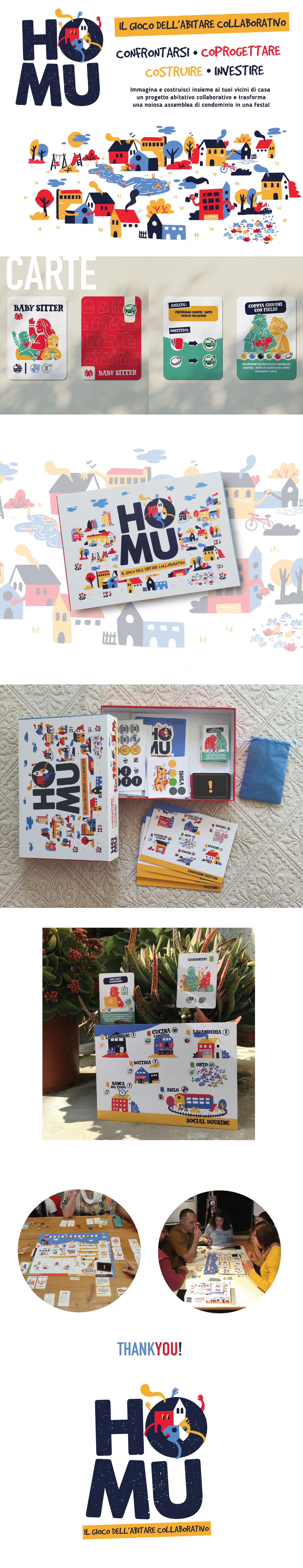 Graphic Design per il gioco da tavolo "HOMU" realizzato per RE.COH Associazione Sarda per la promozione del cohousing e con la collaborazione della Game Designer Alessia Luca.