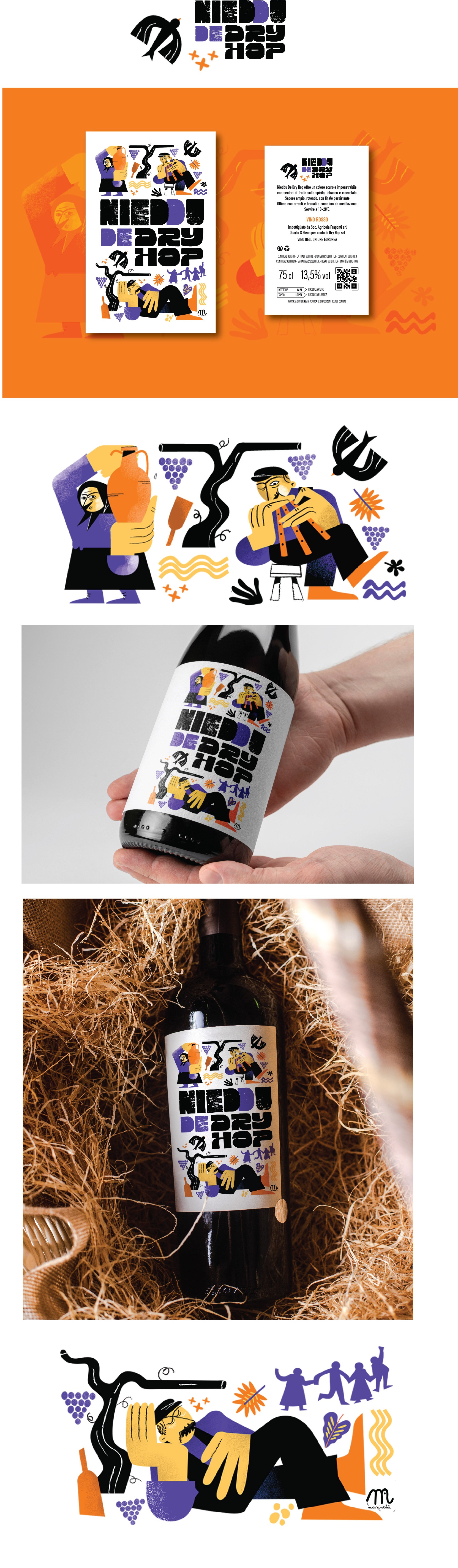 Design etichetta per il vino "NIEDDU" prodotto e imbottigliato dalle cantine Fraponti di Quartu S.Elena per conto di Dry Hop. L'etichetta presenta motivi e personaggi sardi rivisitati in chiave grafica e ispirati nei tratti ai murales di Orgosolo.